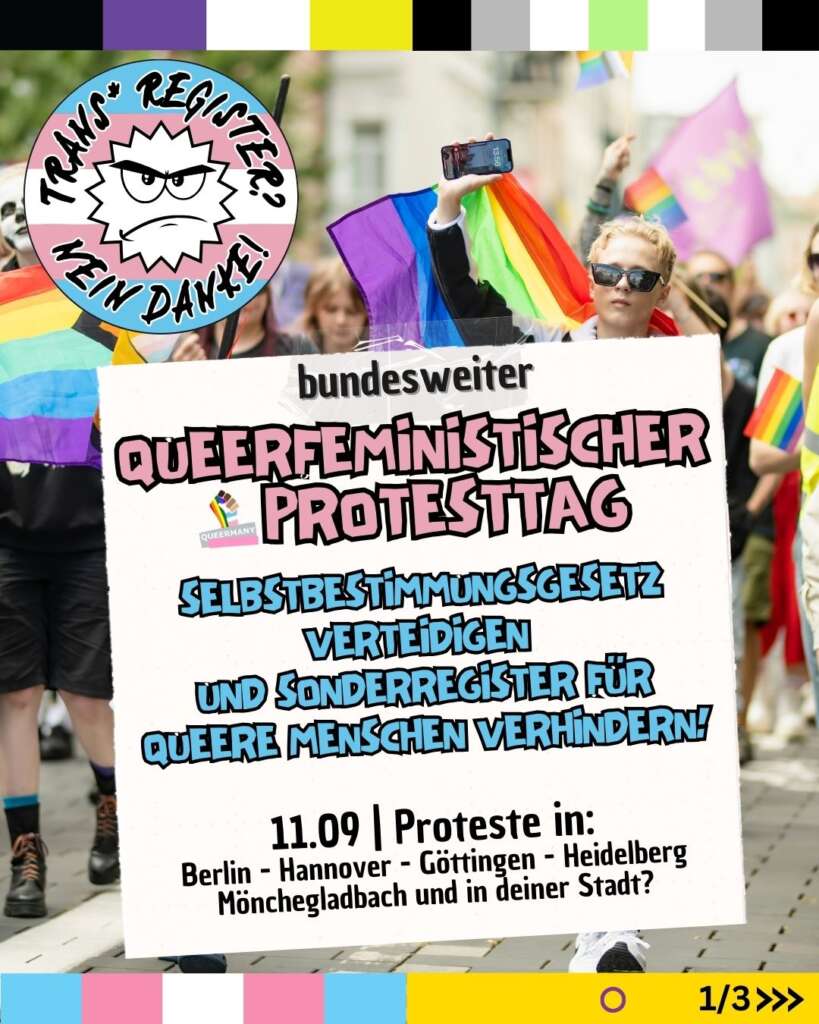 2025 steht Deutschland an einem gefährlichen Wendepunkt – 33 klopft. Rechte und autoritäre Kräfte greifen Frauen-, Queer- und Transrechte an, während soziale Ungleichheit und Klimakrise zunehmen. Queermany ist eine bundesweite, diversitätsfreundliche queerfeministische Protest- und Kampagnenbewegung, verankert in lokalen antifaschistischen, queerfeministischen und sozialen Protesten. Wir kämpfen für eine solidarische Gesellschaft, in der niemand Angst haben muss, wegen Geschlecht, Identität, sexueller Orientierung, Herkunft oder sozialer Lage benachteiligt zu werden.